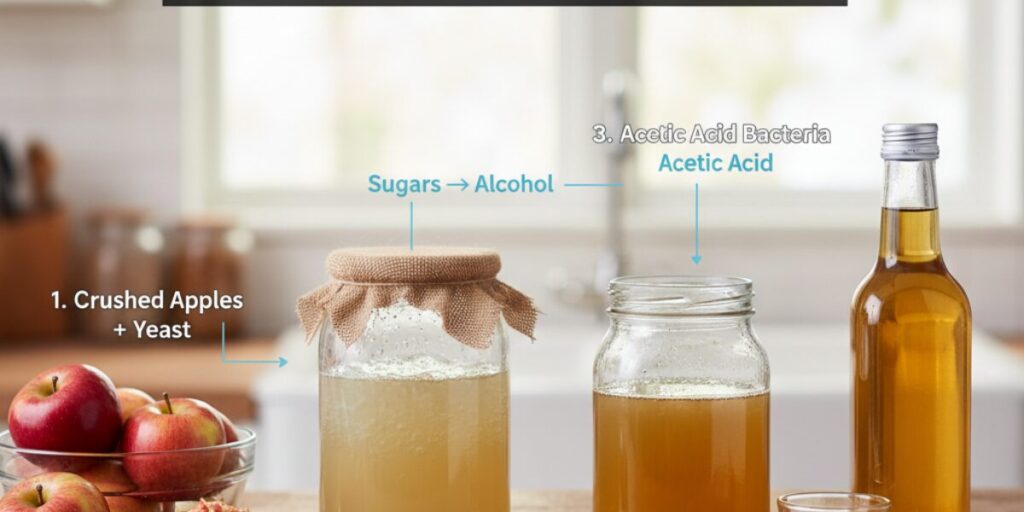 ACV stands for apple cider vinegar, which is essentially vinegar made from fermented crushed apples with the aid of yeast. The method is that bacteria are converting the alcohol (just made from the sugars of the apples) into acetic acid.