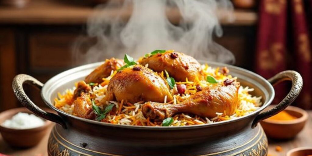 The Hyderabadi Chicken Biryani Recipe has its roots in the royal kitchens of the Nizams. It was inspired by Mughlai and Persian cuisines but developed its own local flavors in Hyderabad. Over time, it became a symbol of the city’s food culture and heritage.